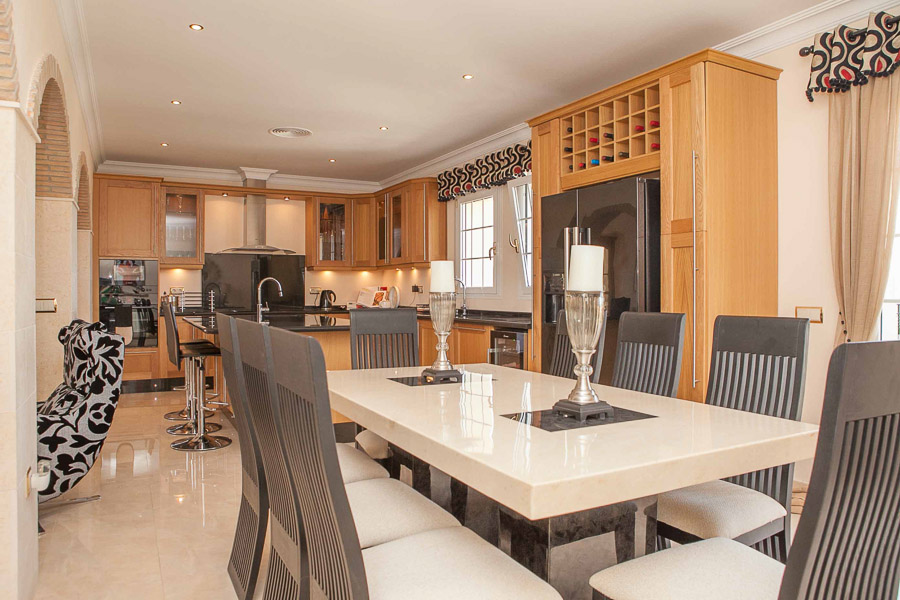 The main kitchen is fully fitted with a free standing island for food preparation and a large dining area with a feature dining table and a capacity for 6-8 people. A separate breakfast bar with further preparation space and fitted cupboards completes this large exceptional kitchen and dining area. A lounge area communicates with the kitchen. A utility room adjoins the kitchen also.